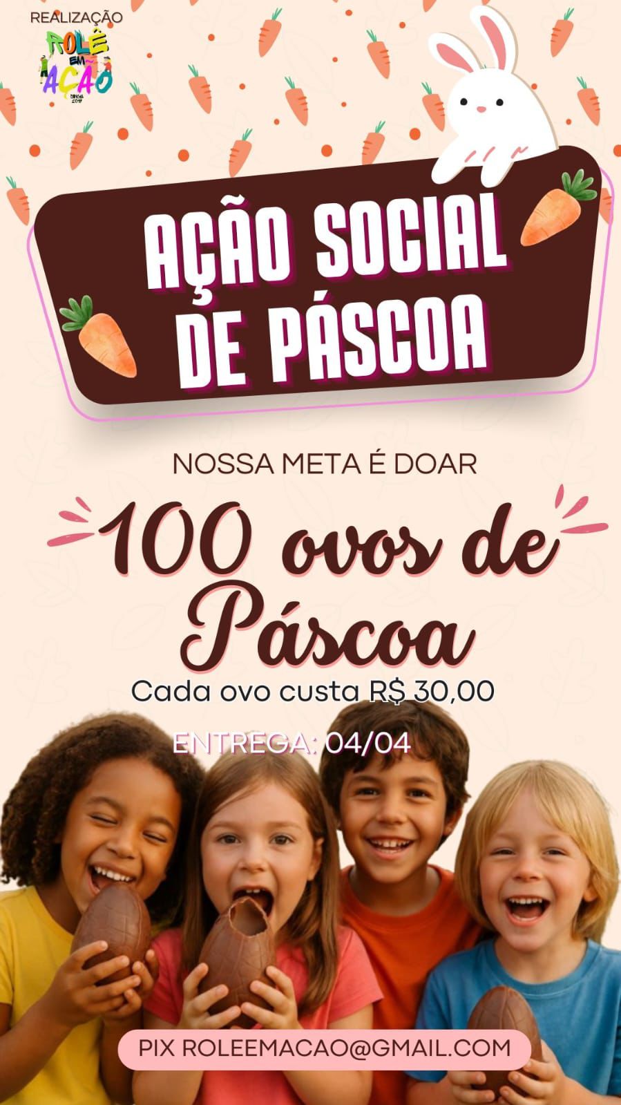 Páscoa Solidária 2026: ajude a levar mais alegria para nossas crianças Nesta Páscoa Solidária 2026, o Rolê em Ação quer transformar carinho em gesto concreto. Nossa missão é arrecadar recursos para doar 100 ovos de Páscoa e tornar essa data ainda mais especial para muitas crianças. Mais do que chocolate,